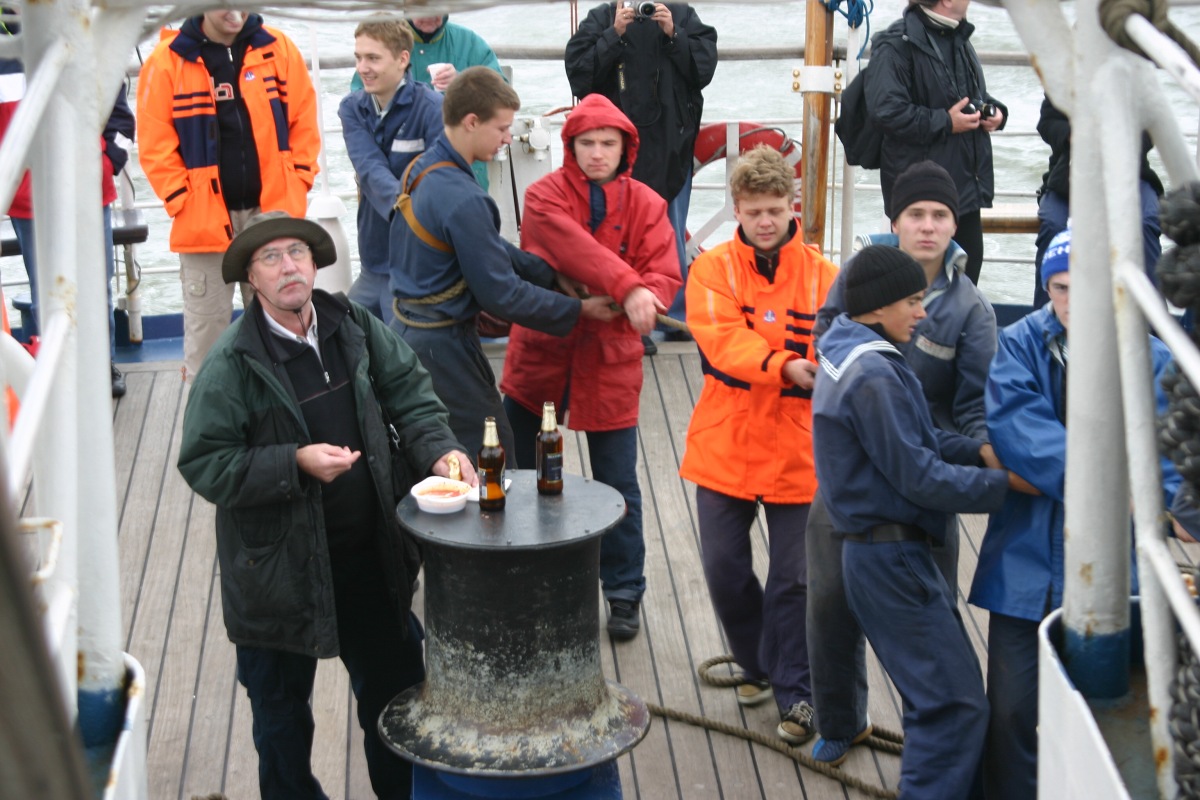 Das Segelsetzen funktioniert nur, wenn alle im wahrsten Sinne des Wortes an einem Strang ziehen. Die Besucher nehmen derweil eine kleine Stärkung ein ;-)