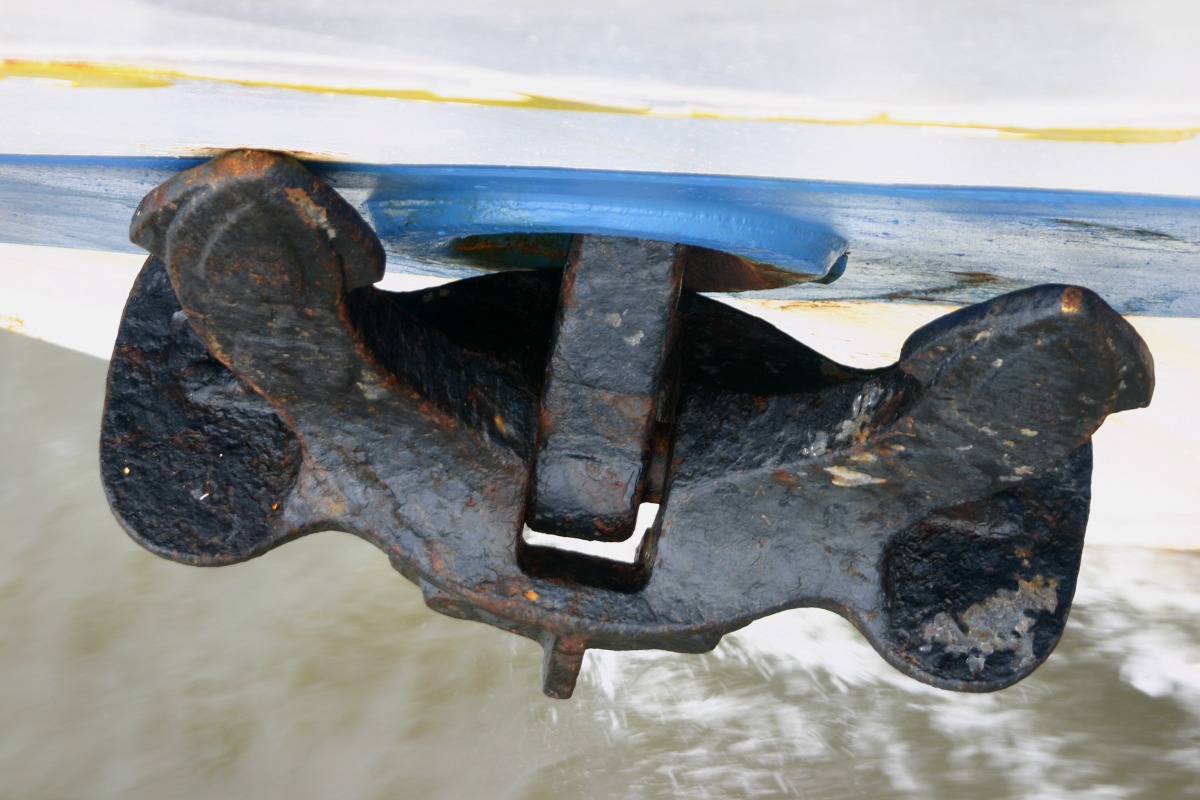 Der Anker auf der Backbordseite von oben über die Reling fotografiert...