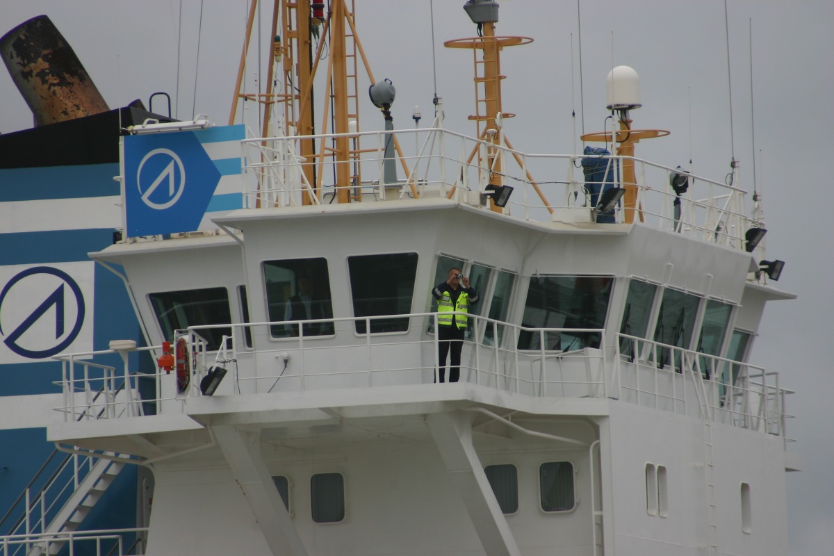 Und auch der Weser-Lotse auf dem vorbeifahrenden Containerschiff "Pirita" macht ein Foto von der "Mir" für das Privatalbum...