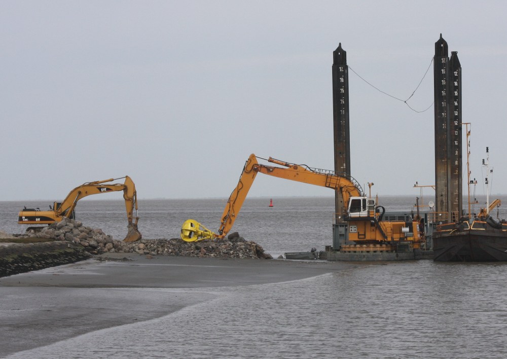 30.03.08: Kein leichter Job, die dicken Felsbrocken aus den Buhnen herauszuhauen...