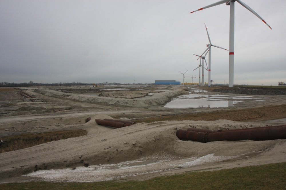 die riesigen Test-Offshore-Windräder auf dem Spülgelände... Im Vordergrund