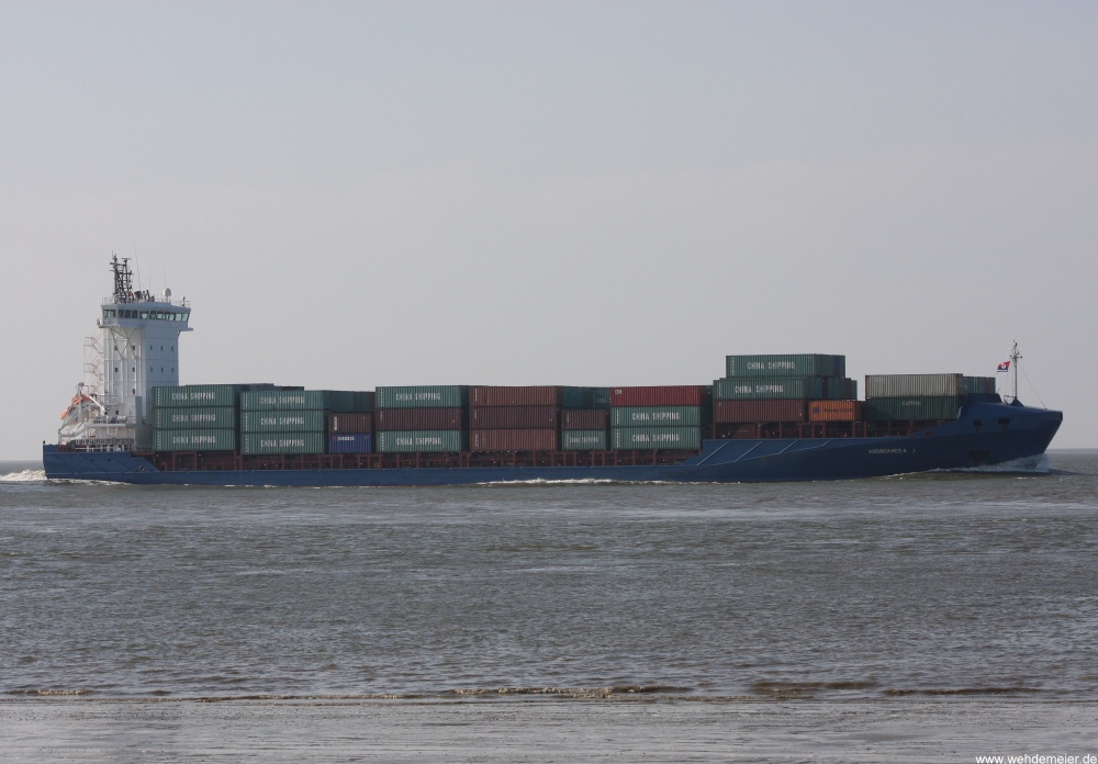 Frachtschiff elbaufwärts zwischen Altenbruch und Otterndorf am 06.05.2008