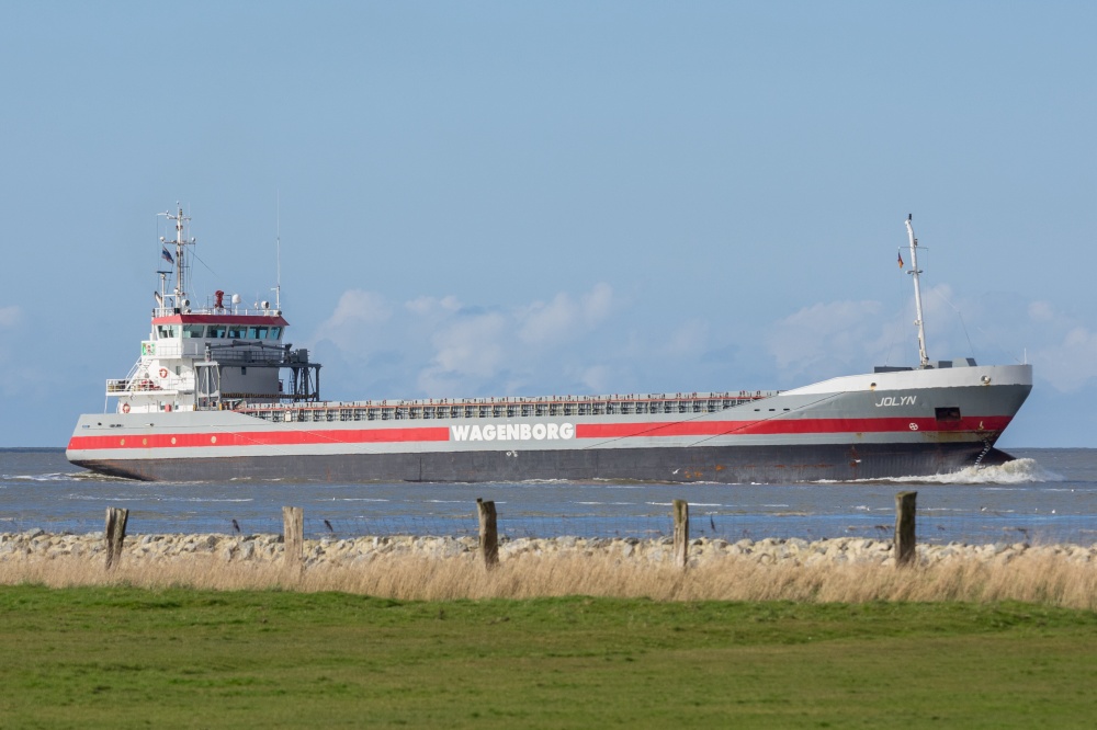 Frachtschiff elbaufwärts vor Cuxhaven-Altenbruch am 08.04.2016