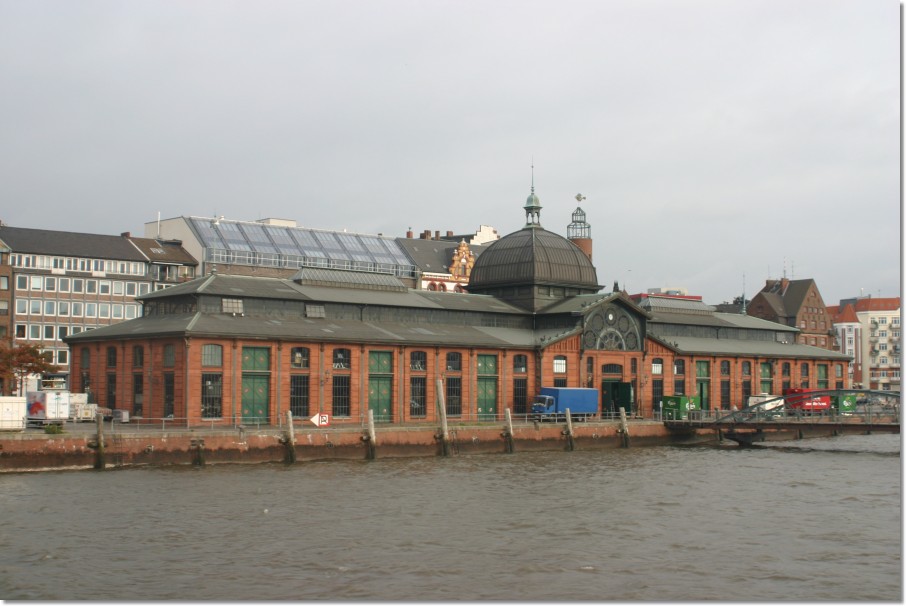 Dies ist die alte Altonaer Fischauktionshalle. Bereits um das Jahr 1600 ist der Fischmarkt auf St. Pauli als Verkaufsstätte erwähnt. Heutzutage wird hier jeden Sonntagmorgen ein buntes Warensortiment angeboten, eindrucksvoll ist auch immer wieder die Ausdauer der stimmgewaltigen Marktschreier. |