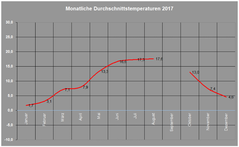 Übersicht über die monatlichen Durchschnittestemperaturen für Cuxhaven im Jahr 2017