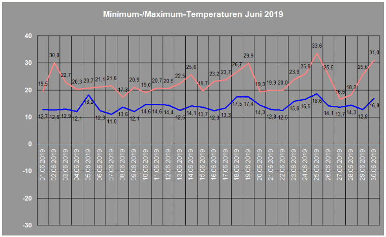 Durchschnittstemperatur im Juni 2019: 18,2° C