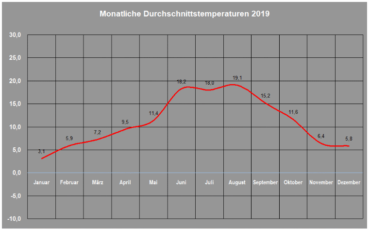 Übersicht über die monatlichen Durchschnittestemperaturen für Cuxhaven im Jahr 2019