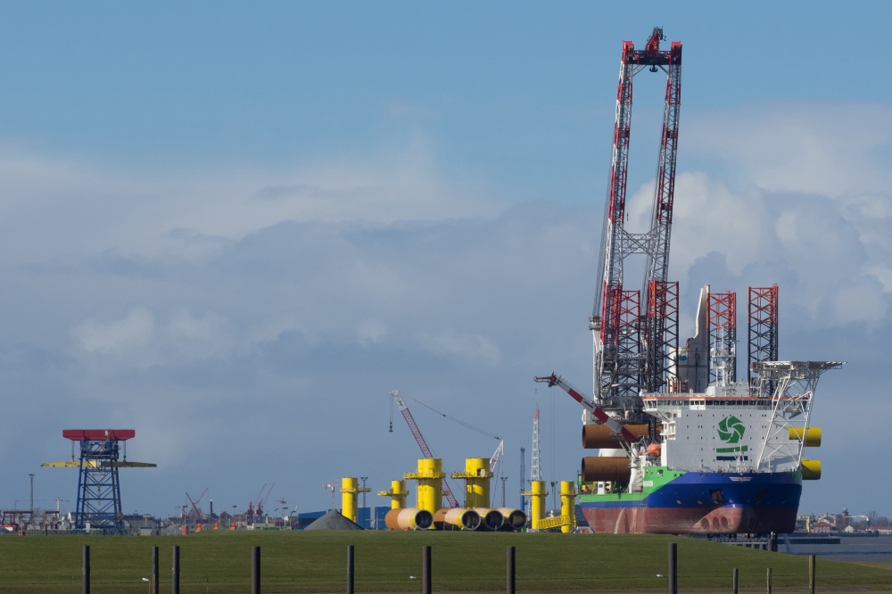 24.02.2016: Verladung der Turmsegmente der Fa. AMBAU GmbH auf das Offshore-Errichterschiff "Innovation" am Elbufer.