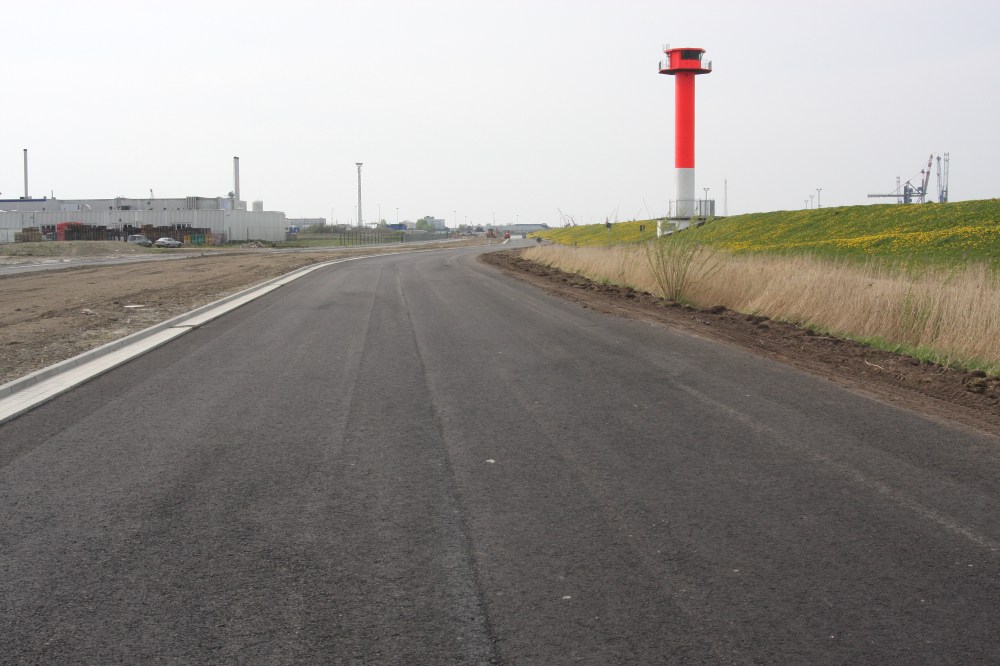 27.04.2008: Dies wird die Verbindungsstraße, über die zukünftig die Schwertransporte zwischen Schwerlastplattform östlich vom CuxPort-Terminal und den Fertigungsstätten der AMBAU GmbH und CSC fahren.
