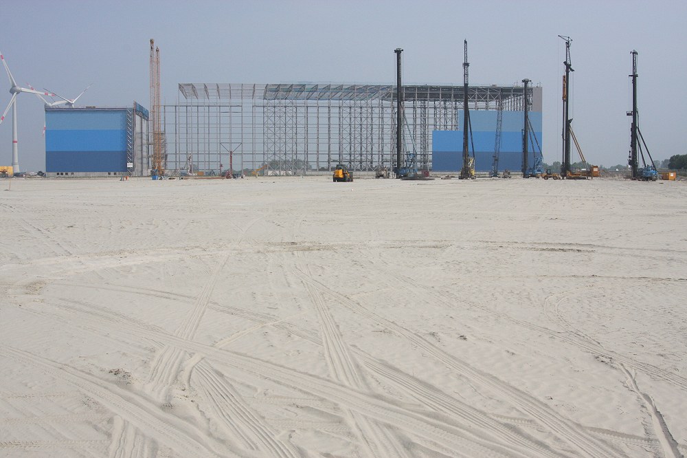 01.06.2008: Die freie und zuvor planierte Fläche westlich von CSC GmbH gelegen; rechts erkennt man die Rammen, wo später die Halle der Fa. AMBAU entsteht.