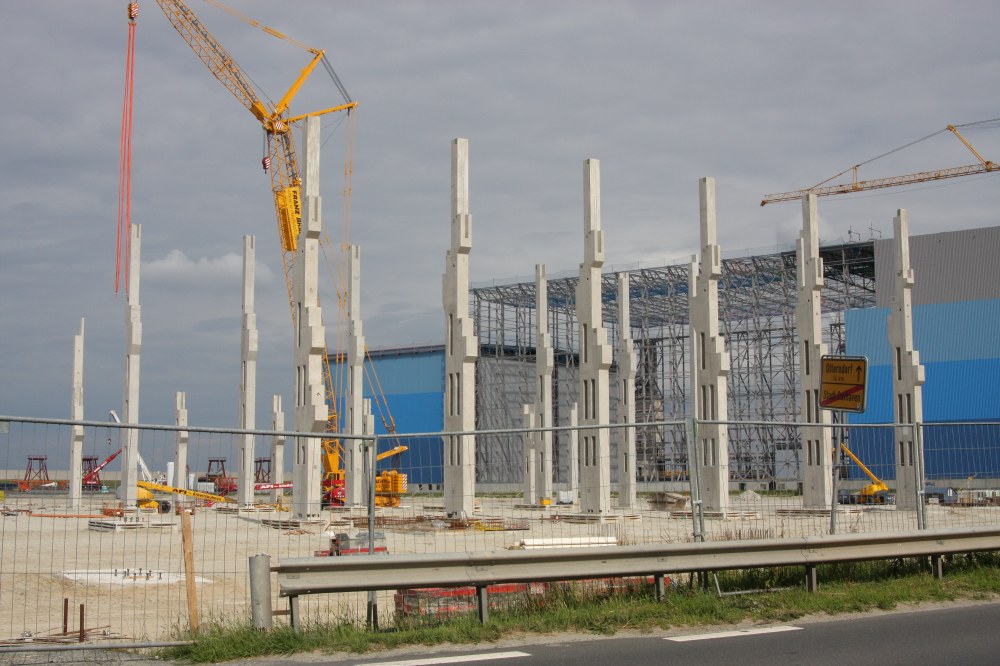 13.07.2008: Die ersten Stahlträger der zukünftigen Montagehallen der Fa. AMBAU am Hafenzubringer strecken sich in den Himmel.