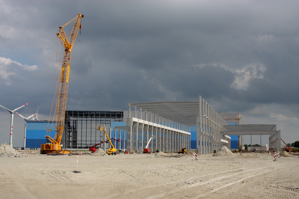 03.08.2008: Der Bau schreitet weiter voran... Im Vordergrund der Hallenkomplex der AMBAU GmbH, dahinter in blauem Farbanstrich die Halle von CSC.