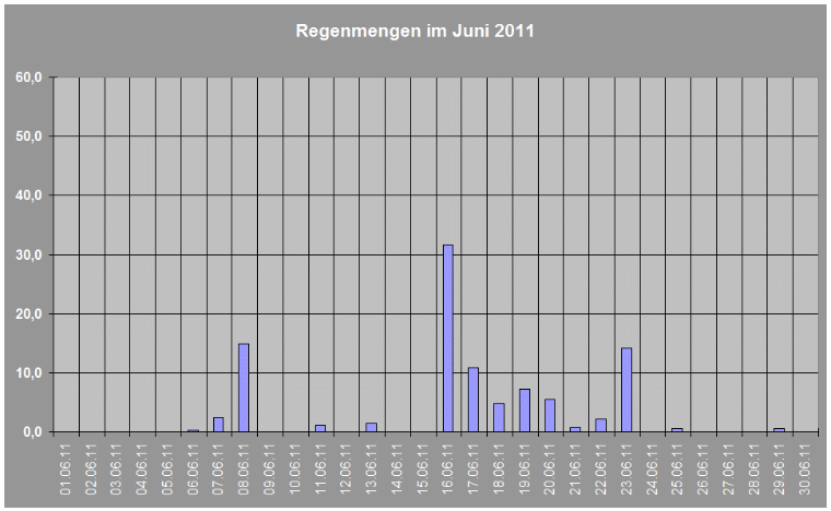 Regenmengen im Monat Juni 2011 insgesamt: 98,5 L/qm