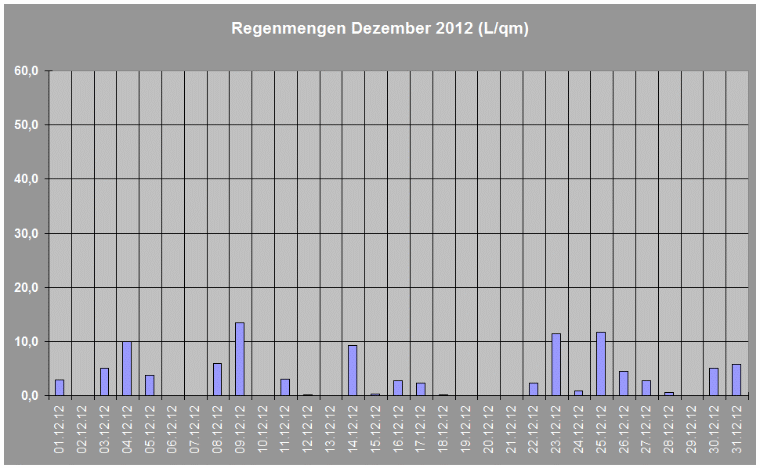 Regenmengen im Dezember 2012 insgesamt: 104,1 L/qm