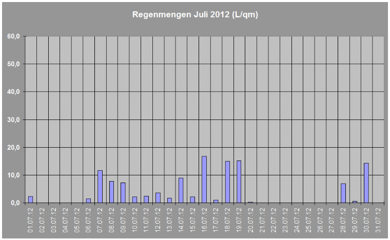 Regenmengen im Juli 2012 insgesamt: 121,6 L/qm
