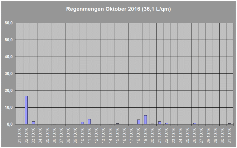 Regenmengen im Oktober 2016 insgesamt: 36,1 L/qm
