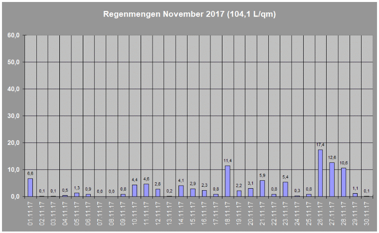 Regenmengen im November 2017 insgesamt: 104,1 L/qm