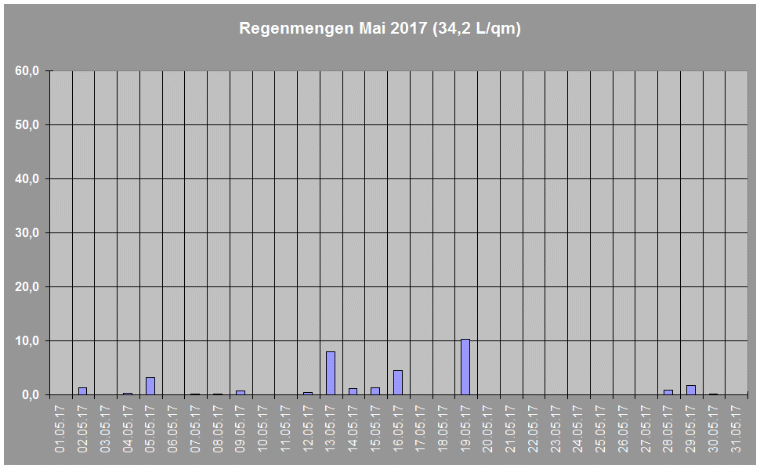 Regenmengen im Mai 2017 insgesamt: 34,2 L/qm