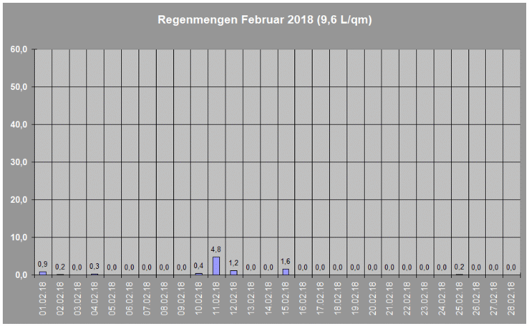 Regenmengen im Februar 2018 insgesamt: 9,6 L/qm