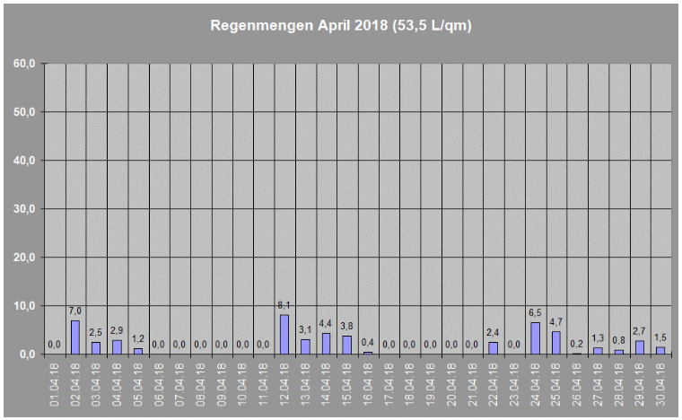 Regenmengen im April 2018 insgesamt: 53,5 L/qm