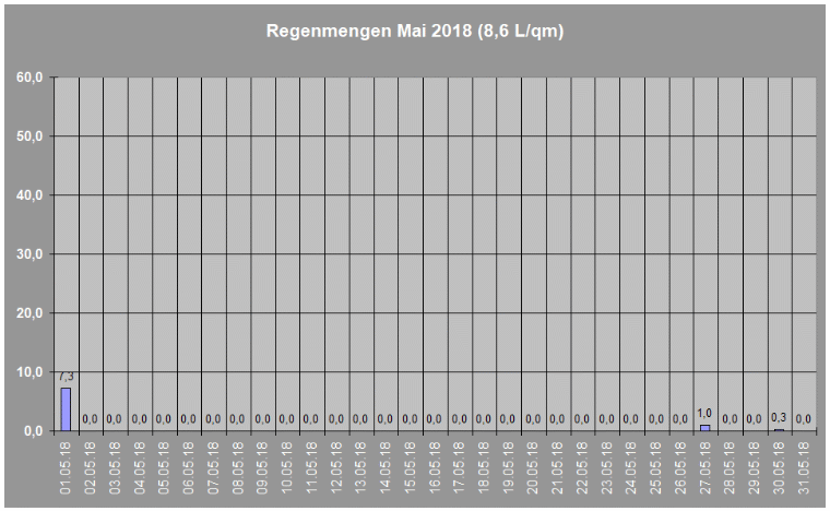 Regenmengen im Mai 2018 insgesamt: 8,6 L/qm