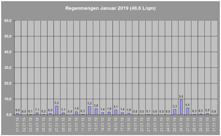 Regenmengen im Januar 2019 insgesamt: 48,6 L/qm