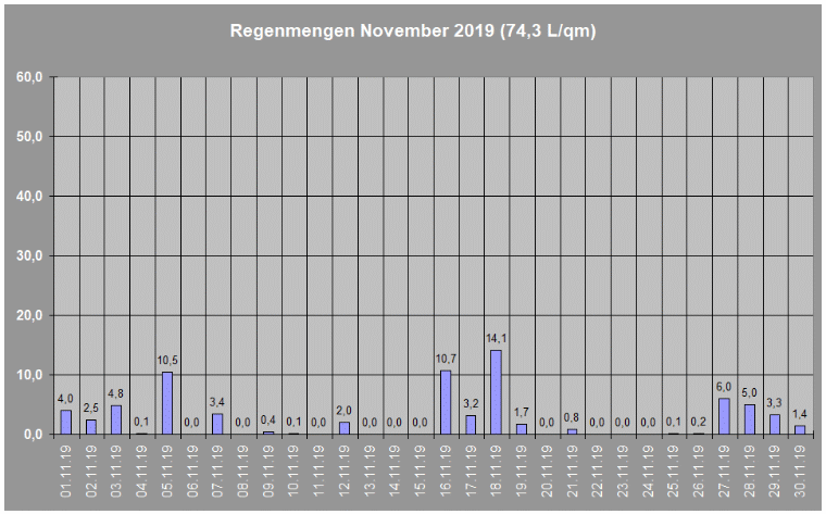 Regenmengen im November 2019 insgesamt: 74,3 L/qm