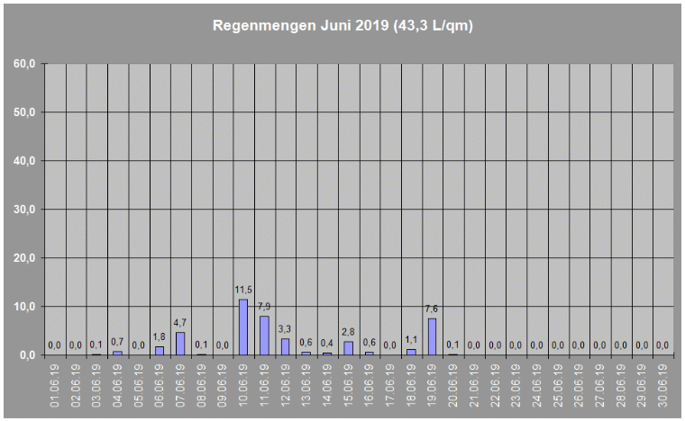 Regenmengen im Juni 2019 insgesamt: 43,3 L/qm