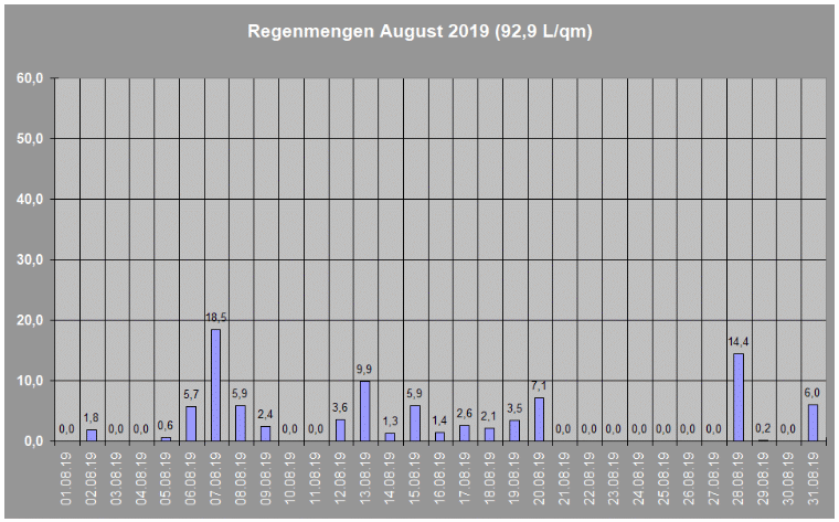 Regenmengen im August 2019 insgesamt: 92,9 L/qm