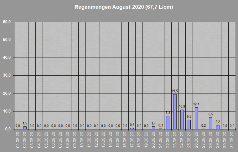 Regenmengen im August 2020 insgesamt: 67,7 L/qm