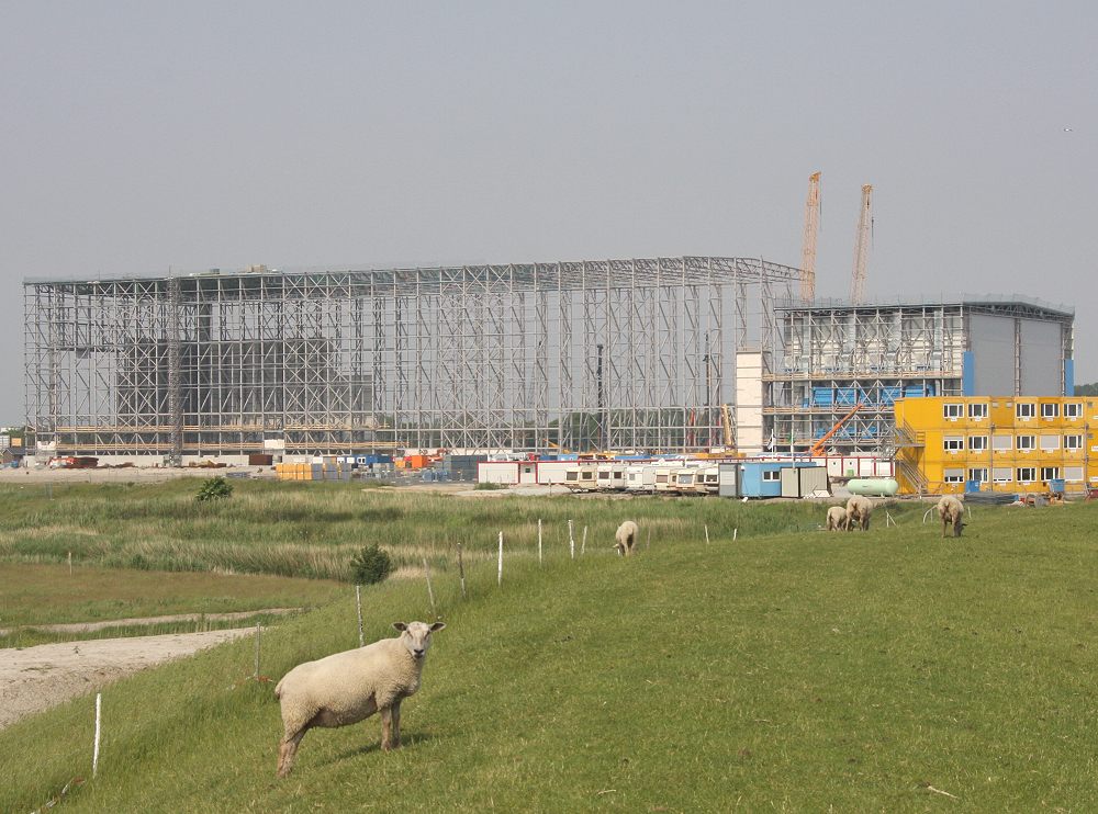 01.06.2008: Blick auf die entstehende Hallenanlage von CSC vom Deich an der östlichen Seite an der Baumrönne.