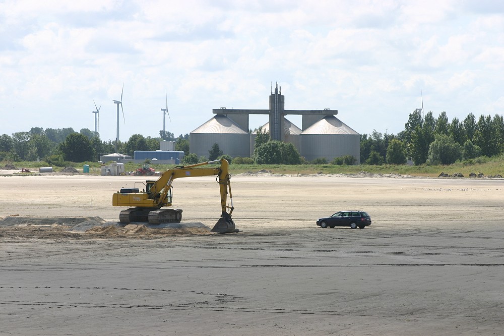 03.08.2007: Nachdem die gesamte Fläche mit schweren Maschinen ebenerdig gemacht und verdichtet wurde, beginnt ein Bagger mit der Arbeit an einer künftigen Straße, über die die schweren Stahlteile später wahrscheinlich angeliefert werden.