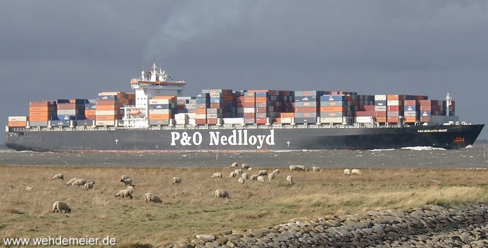 Containerschiff elbaufwärts vor Cuxhaven-Groden im Jahr 2003