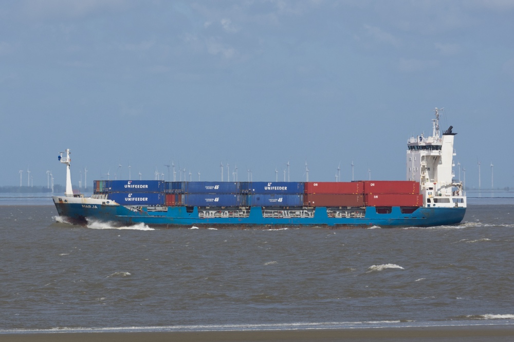 Frachtschiff elbabwärts vor Cuxhaven-Altenbruch am 12.05.2019