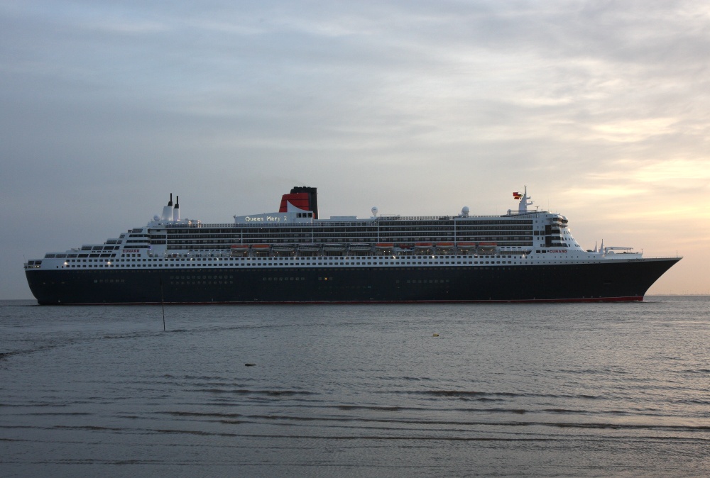 Die "Queen Mary 2" am 26. Mai 2011 elbaufwärts fahrend vor Cuxhaven-Altenbruch