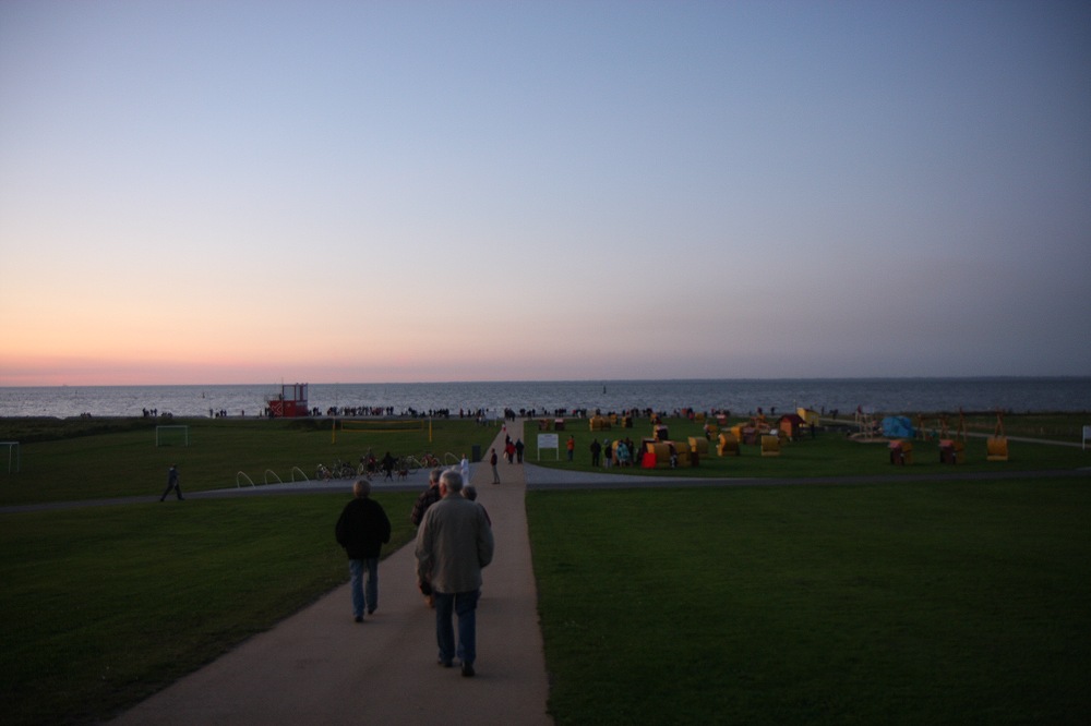QM2 am 11. August 2012: Die Sehleute sammeln sich auf dem Deich beim Eiscafé Panorama und der neuen Strandpromenade