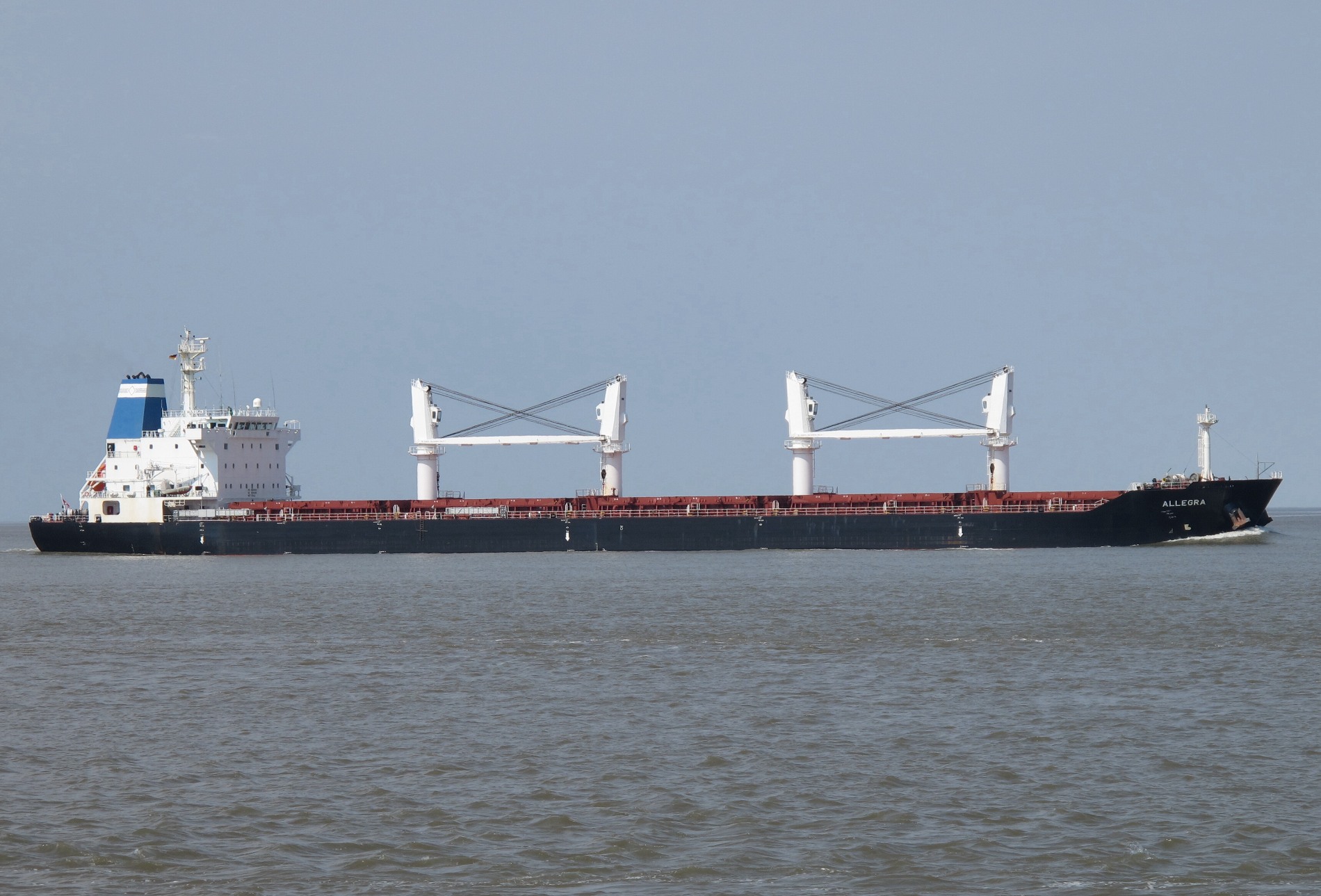 Frachtschiff elbaufwärts vor Cuxhaven-Altenbruch am 1. Mai 2012