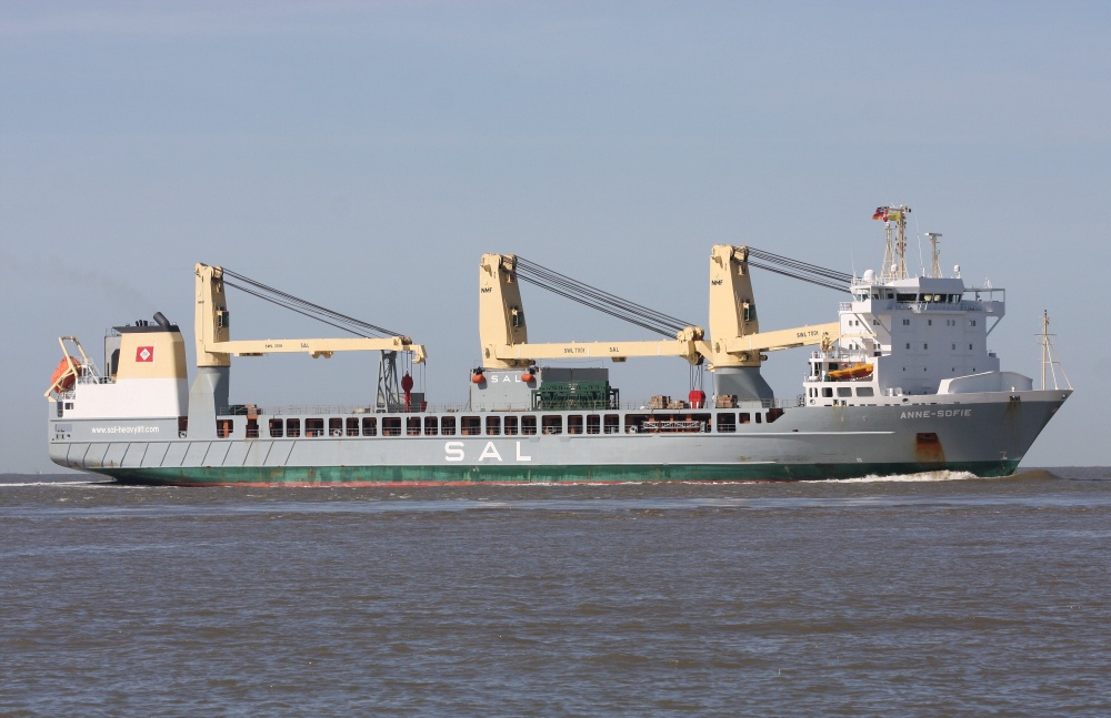 Frachtschiff elbaufwärts in Höhe Glameyer Stack am 16.04.2014
