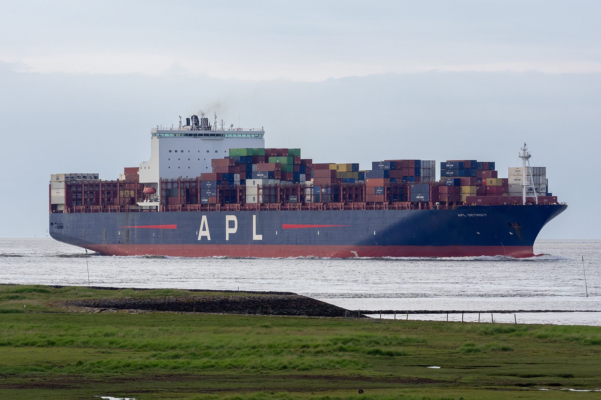 Containerschiff elbaufwärts vor Cuxhaven-Altenbruch am 06.06.2020