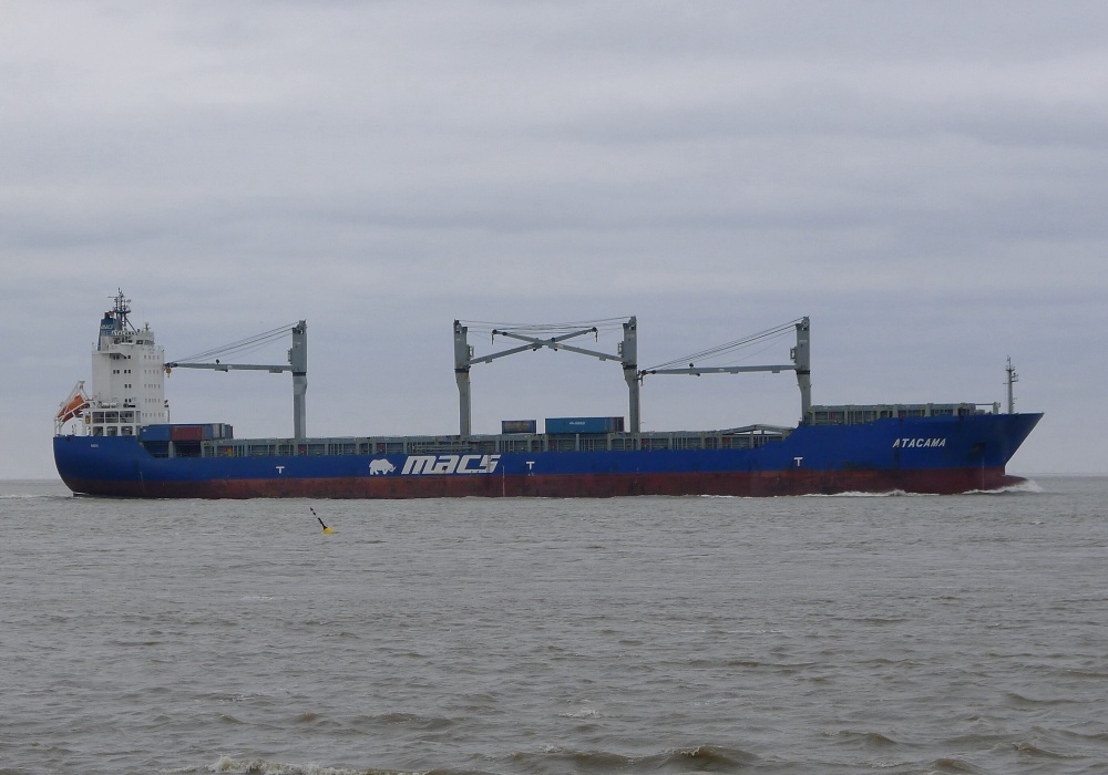 Frachtschiff elbaufwärts vor Cuxhaven-Altenbruch am 04.04.2012