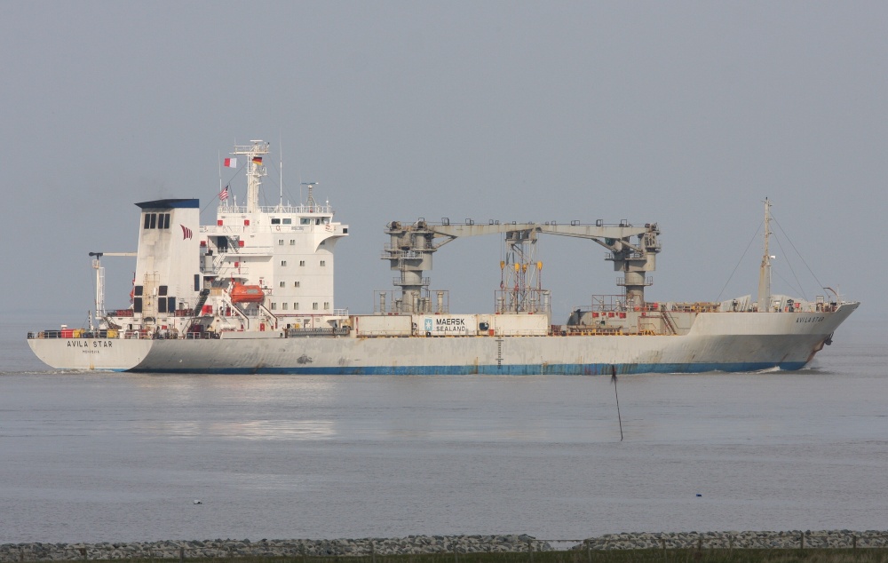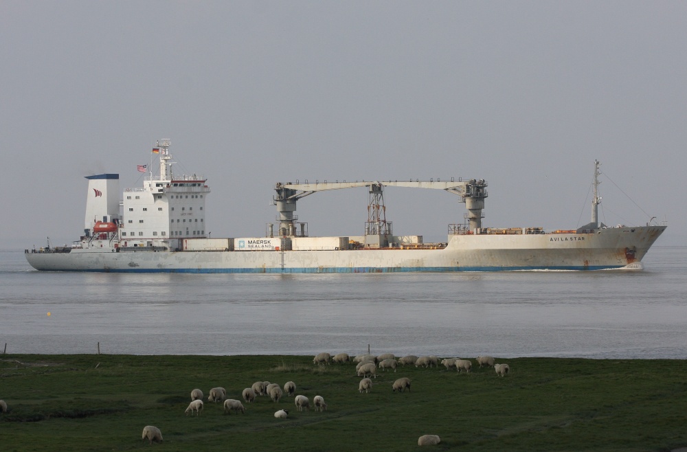 Frachtschiff elbaufwärts vor Cuxhaven-Altenbruch am 22.04.2014