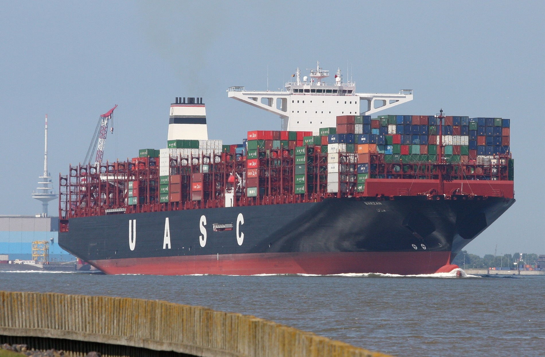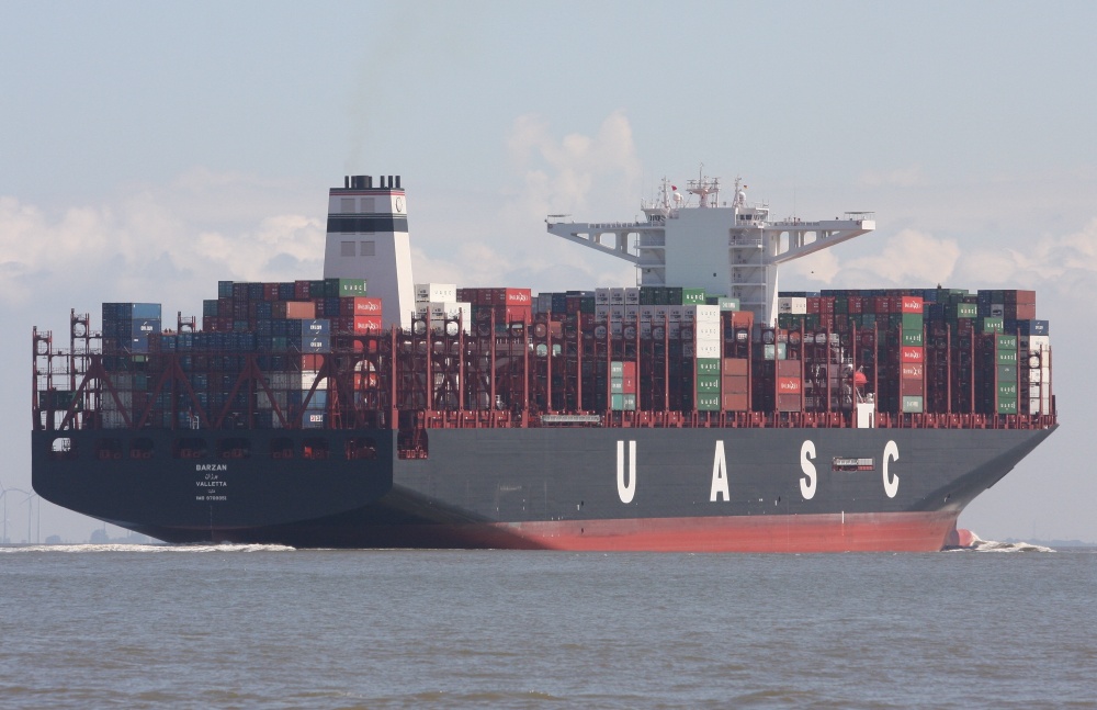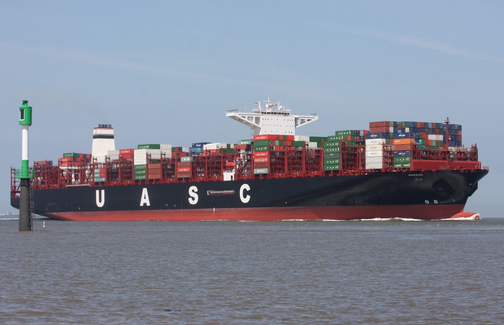 Containerschiff elbaufwärts in Höhe Glameyer Stack am 29.05.2015