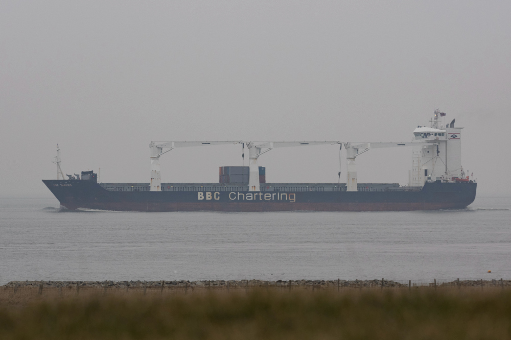 Frachtschiff elbabwärts vor Cuxhaven-Altenbruch am 25.03.2018