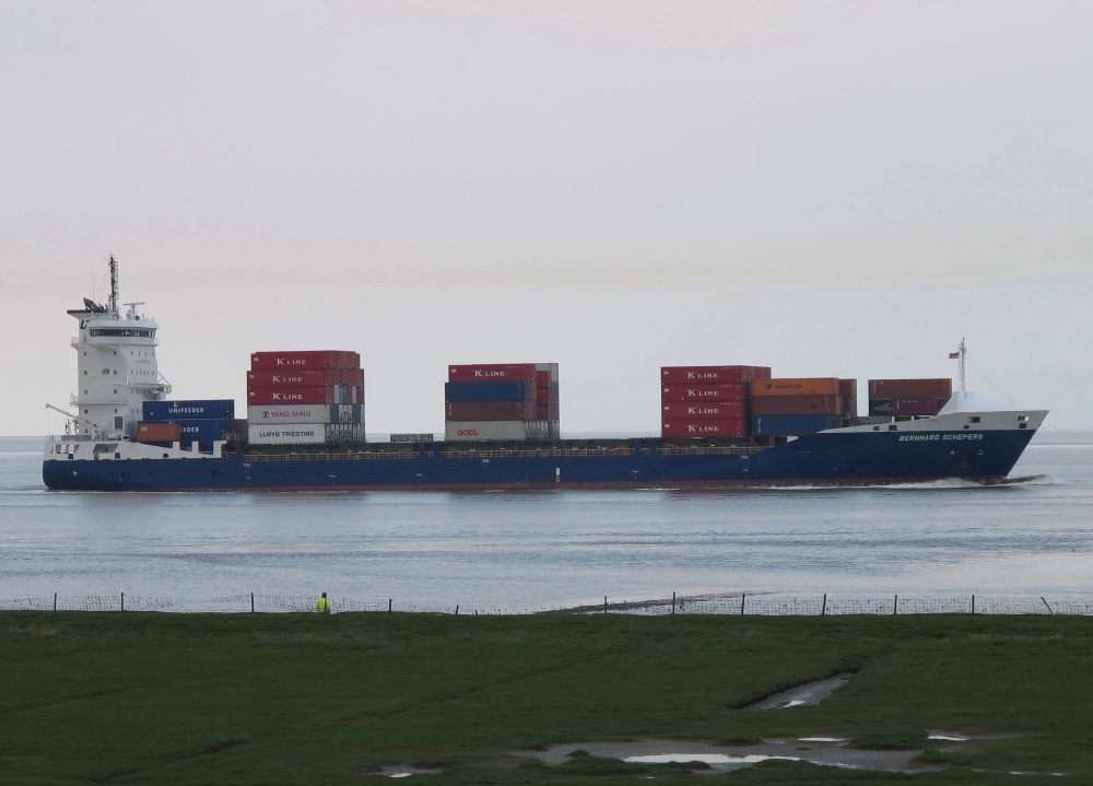 Frachtschiff elbaufwärts vor Cuxhaven-Altenbruch am 23.04.2012