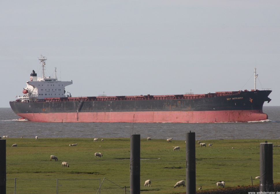 Frachtschiff elbaufwärts vor Cuxhaven-Altenbruch am 22.06.2010
