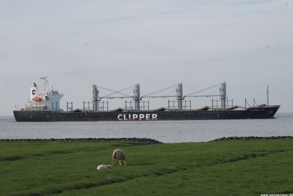 Frachtschiff elbaufwärts vor Cuxhaven-Altenbruch am 09.05.2011