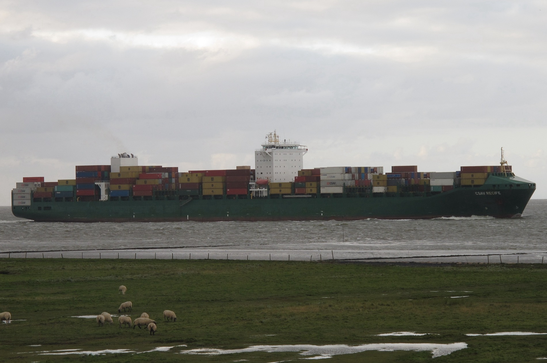 Containerschiff elbaufwärts vor Cuxhaven-Altenbruch am 31.08.2012