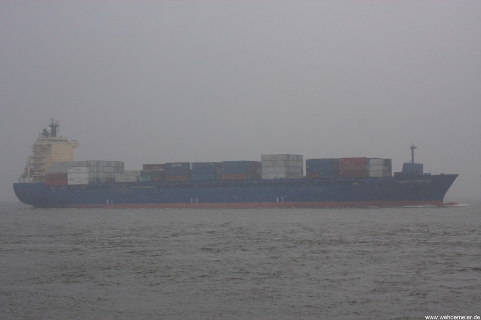 Containerschiff bei dichtem Schneetreiben elbaufwärts vor Cuxhaven-Groden am 15.02.2009