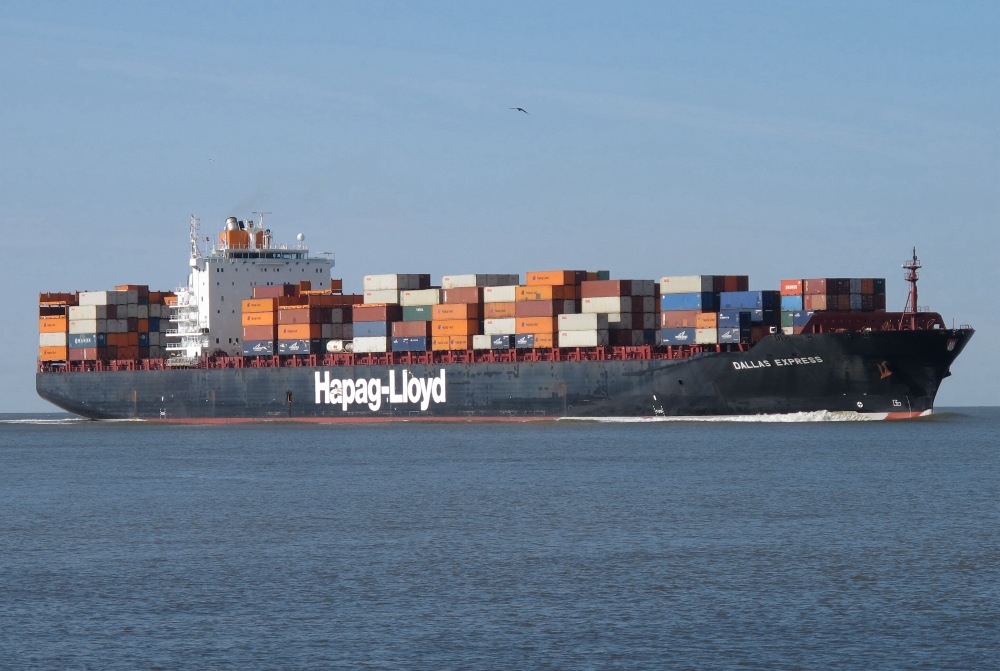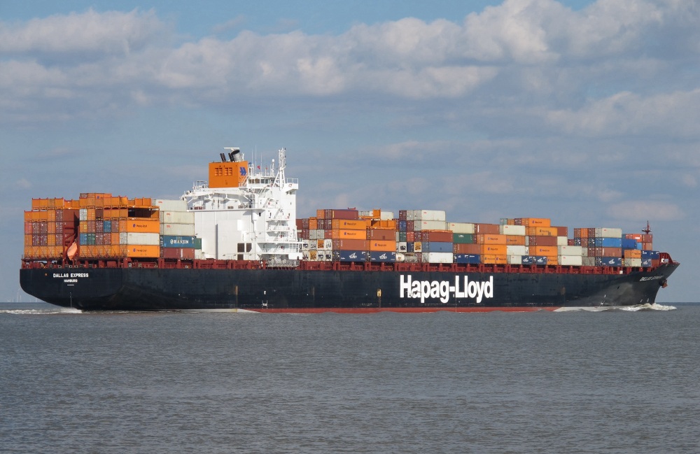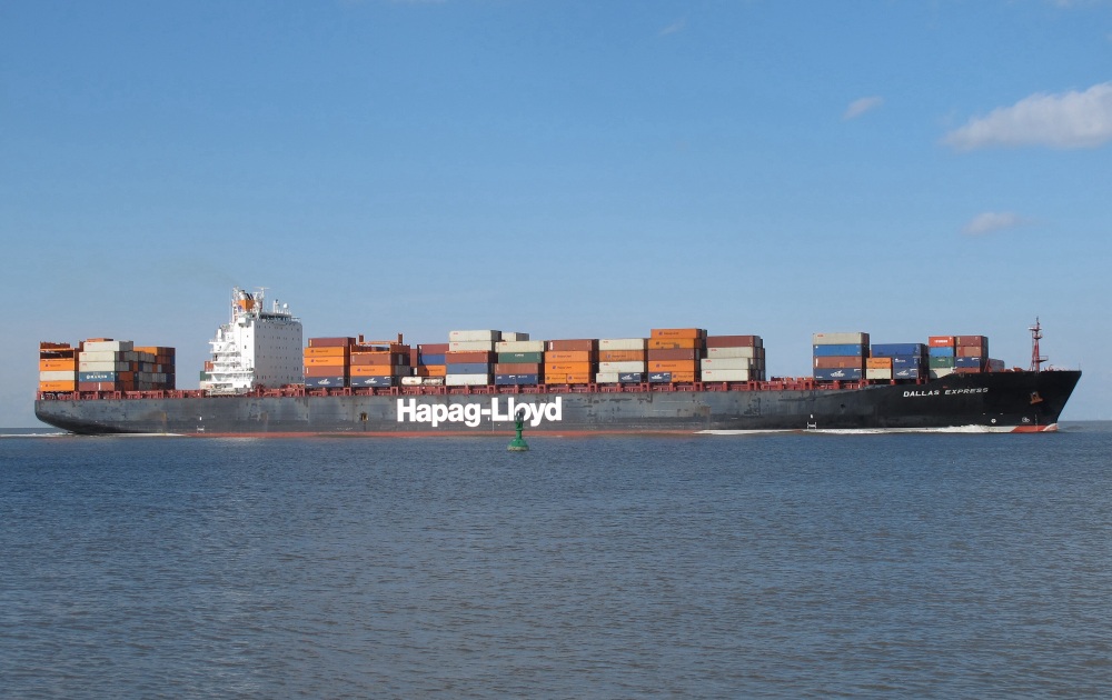 Containerschiff elbaufwärts vor Cuxhaven-Altenbruch am 08.04.2012