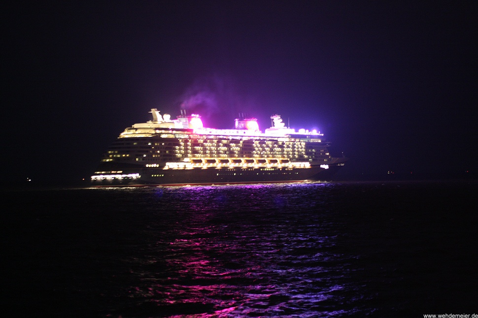 Passagierschiff bei Dunkelheit elbaufwärts vor Cuxhaven am 21.11.2010 auf dem Weg zur Abschlussdockung bei Blohm+Voss